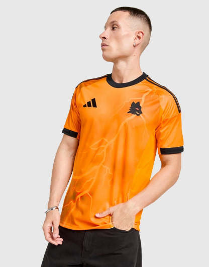 The adidas AS Roma 2025/26 Away Shirt features a striking orange design with black and bright yellow accents, inspired by ancient Roman mythology. A diagonal lightning bolt graphic symbolizes the power of Jupiter, the protector of Rome. The shirt includes black adidas stripes, a crew neck, and the Lupetto wolf crest, honoring the club’s heritage. Made from recycled polyester with HEAT.RDY technology, it ensures comfort and breathability on and off the pitch.