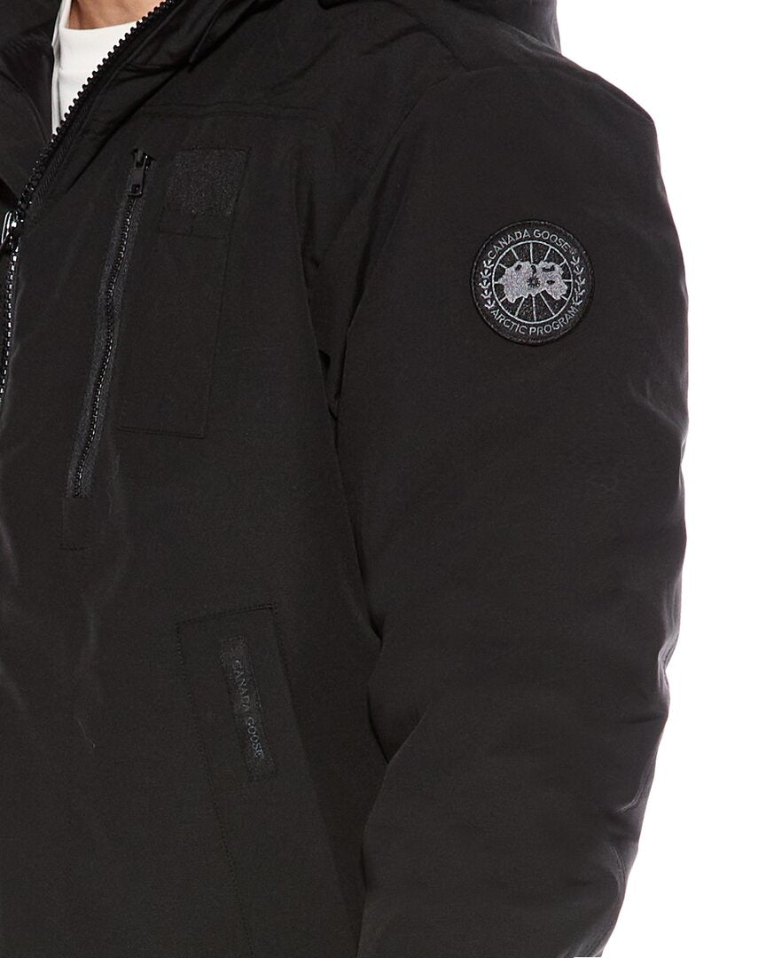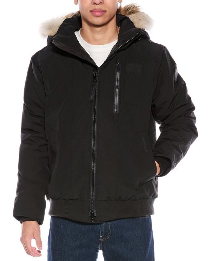 Introducing the Canada Goose Borden Down Bomber, a timeless and functional outerwear piece for men. Crafted with a solid black design, this bomber jacket features a hood with removable fur trim and wired visor, elasticized cuffs and hemline, and multiple pockets for convenience. The heavy weight jacket is filled with 80% white duck down and 20% feathers for ultimate warmth and comfort. Made in Canada, this jacket is designed for those who appreciate quality and style. Dry clean only. Our products are 100% genuine and authentic. Add this premium bomber jacket to your wardrobe for a stylish and practical addition to your outerwear collection.