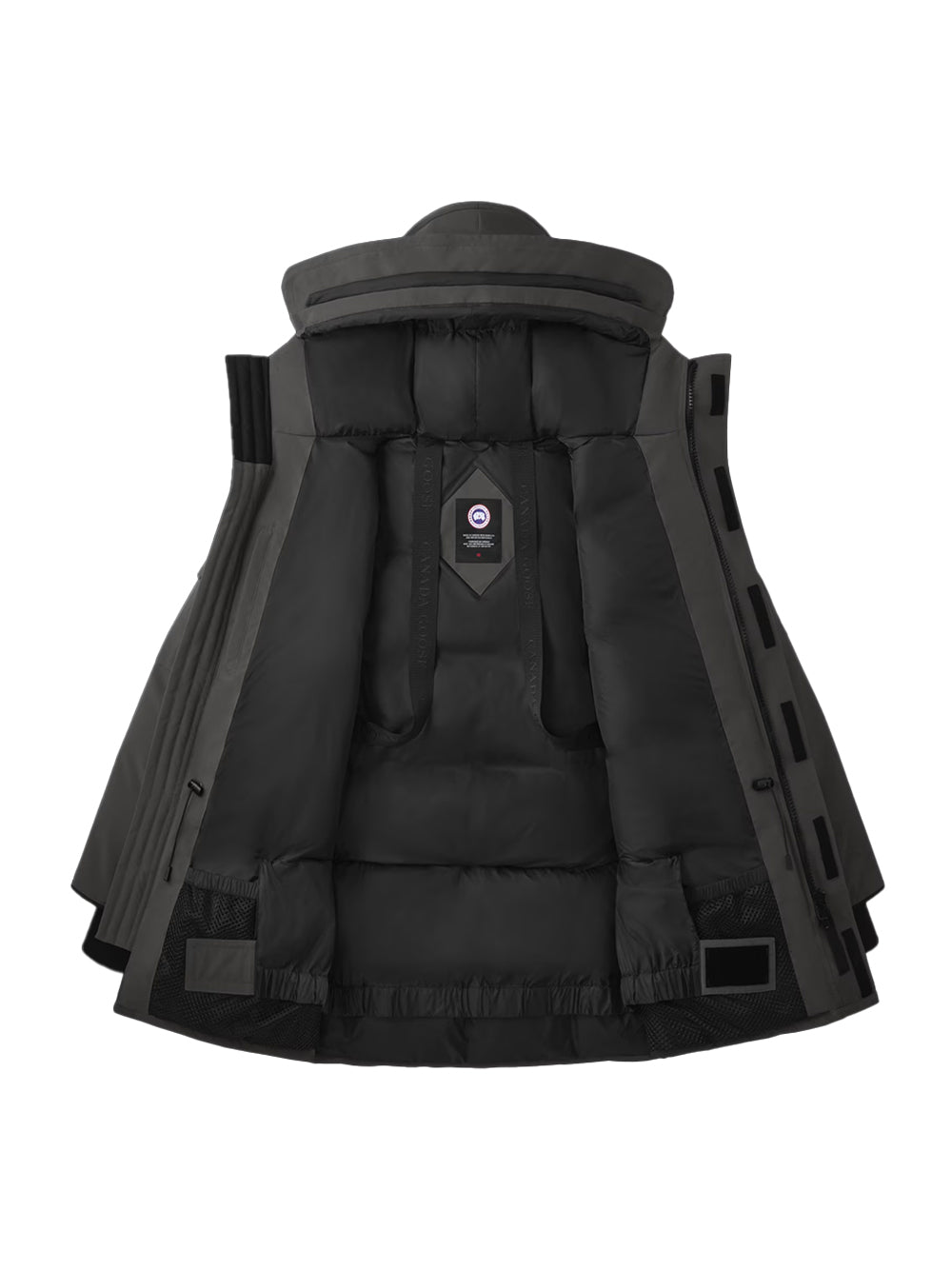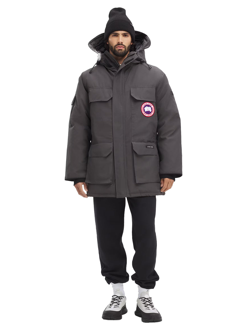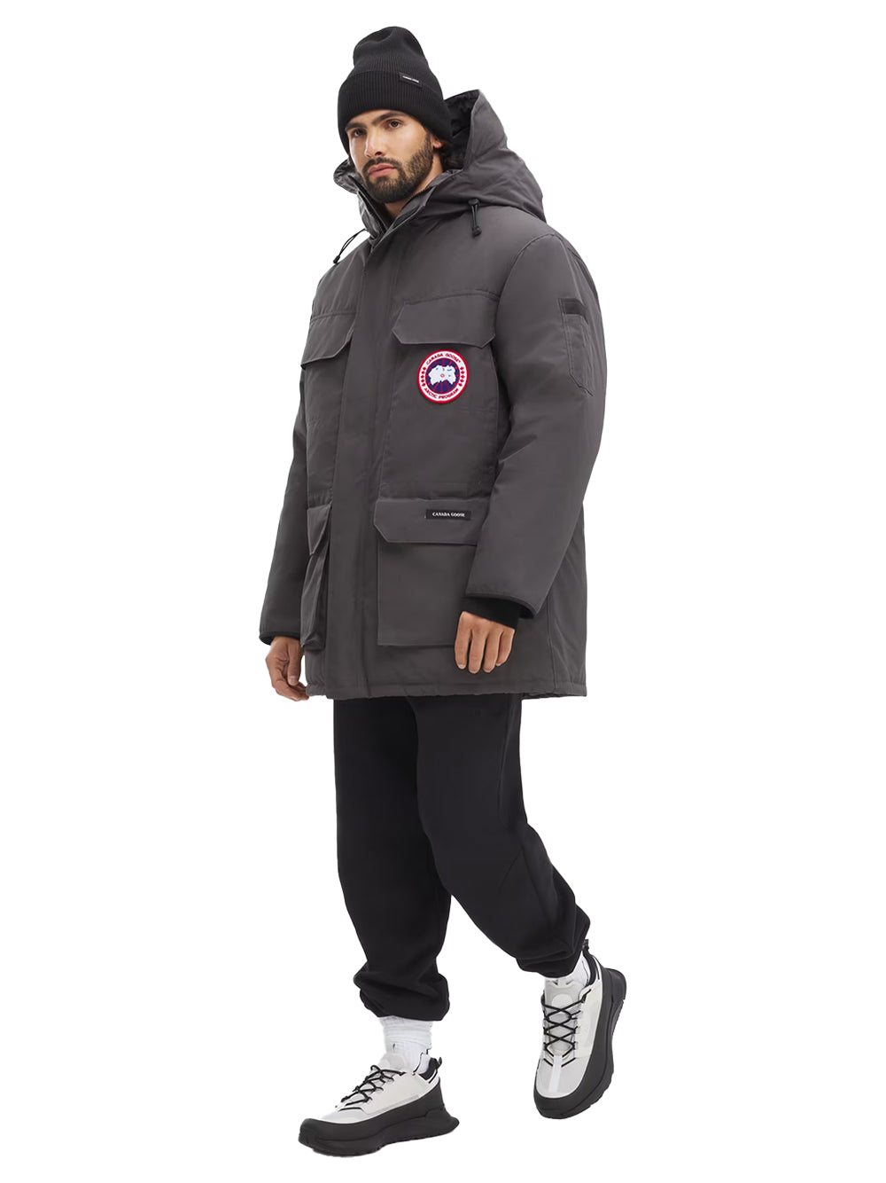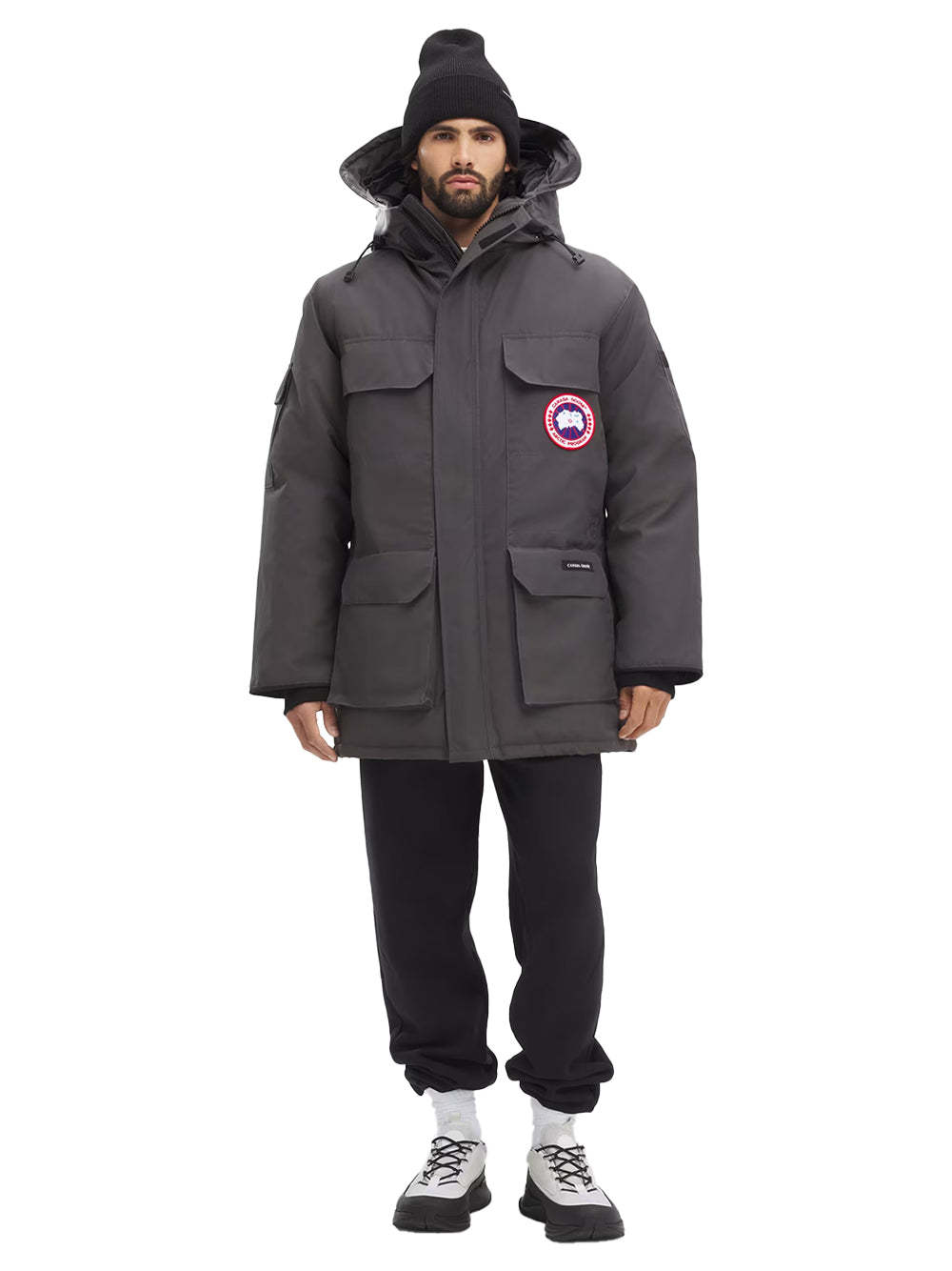 Built for extreme cold, the Canada Goose Expedition Parka Graphite is an oversized and technical with an adjustable down-filled hood and fold-back hood trim. This echoes Trillium and Wyndham styling while adding an internal drawcord waist and Expedition webbing grab strap for on-the-move use.