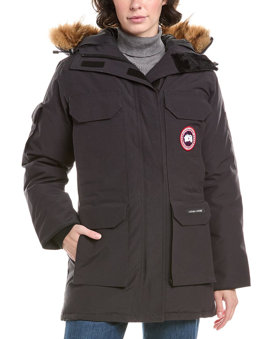 Introducing the Canada Goose Expedition Parka Heritage Parka, a top-of-the-line outerwear piece for women who value both style and function. This navy parka features an adjustable down-filled hood with a removable fur ruff, perfect for combating harsh winds and elements. The chin guard is lined with high-pile fleece for added warmth and comfort, while interior backpack straps allow for hands-free carrying. The waist features an interior drawcord for a customizable fit, and recessed rib-knit cuffs lock in heat. The jacket also includes a hide-away nylon elasticized snow skirt for added protection in snowy conditions. With 6 exterior pockets and a plethora of design details, this parka is as practical as it is stylish. Made in Canada with responsibly sourced down, this parka is a winter essential for the modern woman.