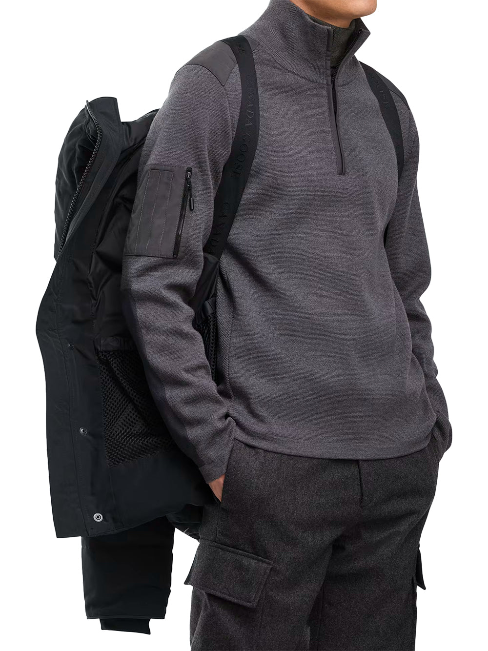 - Sleek interior hanging lining with backpack straps allow jacket to be carried hands-free over the shoulders