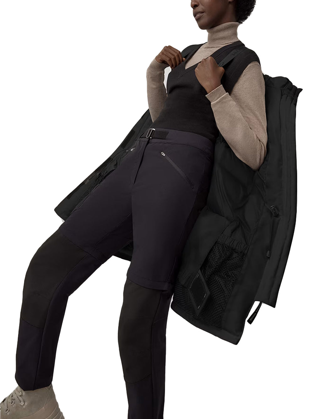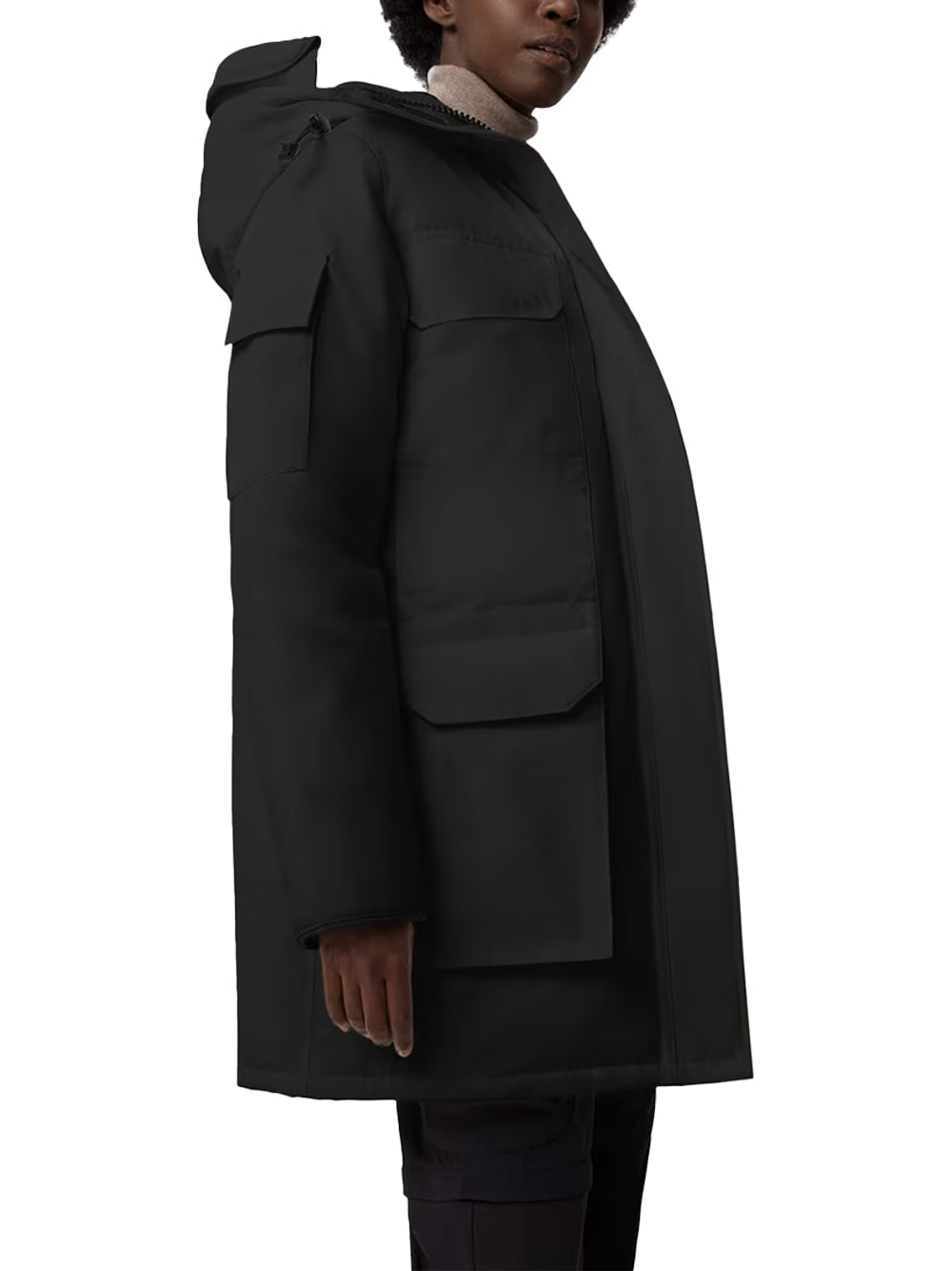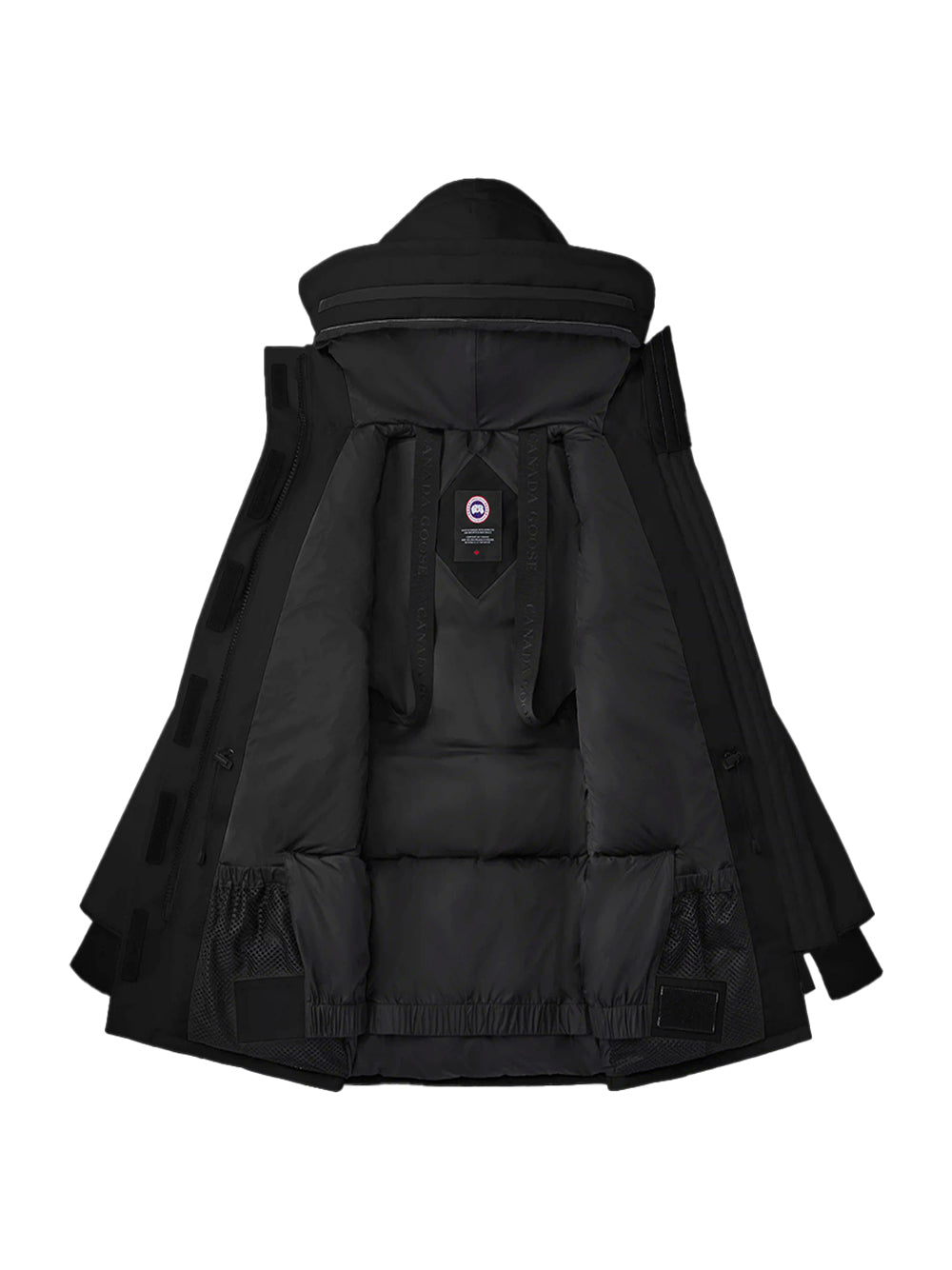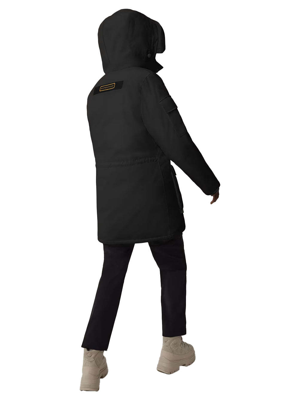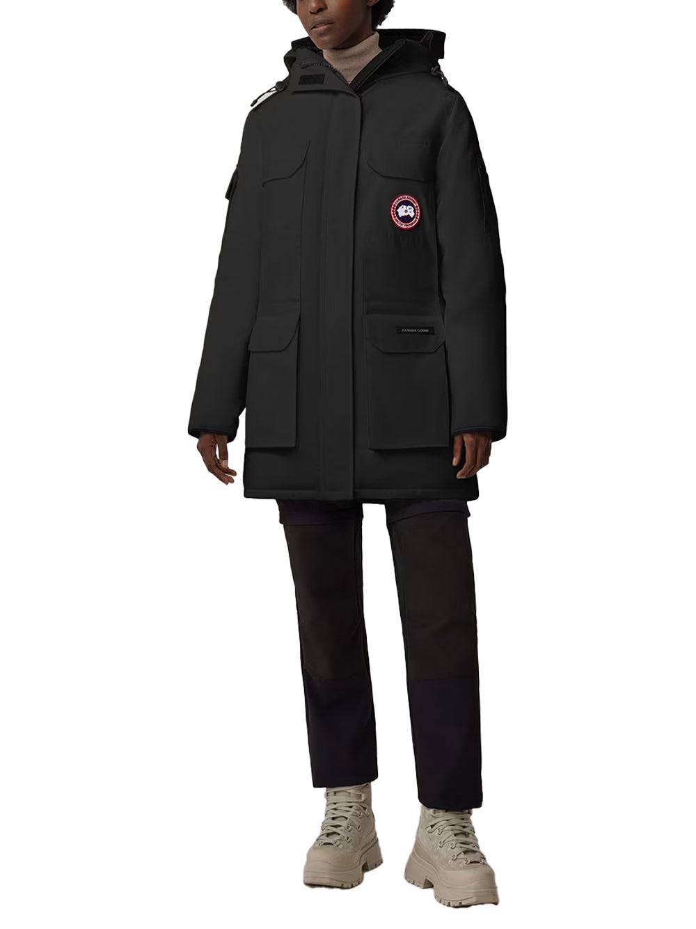 The Canada Goose Expedition Parka Black is an oversized and technical with an adjustable down hood and tricot chin guard. As an it adds Expedition webbing, internal waist drawcord and recessed rib cuffs. A-style build and features removable backpack straps, nylon snow skirt and four secure pockets.