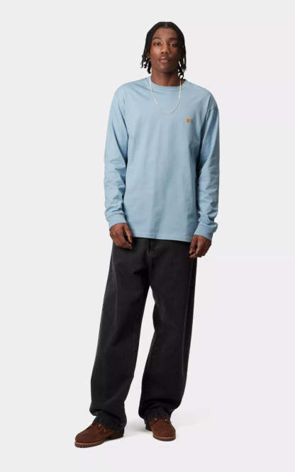 The Landon Pant is made of Robertson denim, which is a heavyweight fabric that has been stone-washed for a softer feel. It is cut in a loose tapered fit with a regular waist, meaning that the pant has a roomy upper leg which tapers below the knee. The five-pocket style is detailed with a Square Label on the rear.