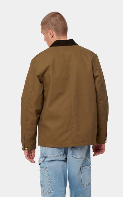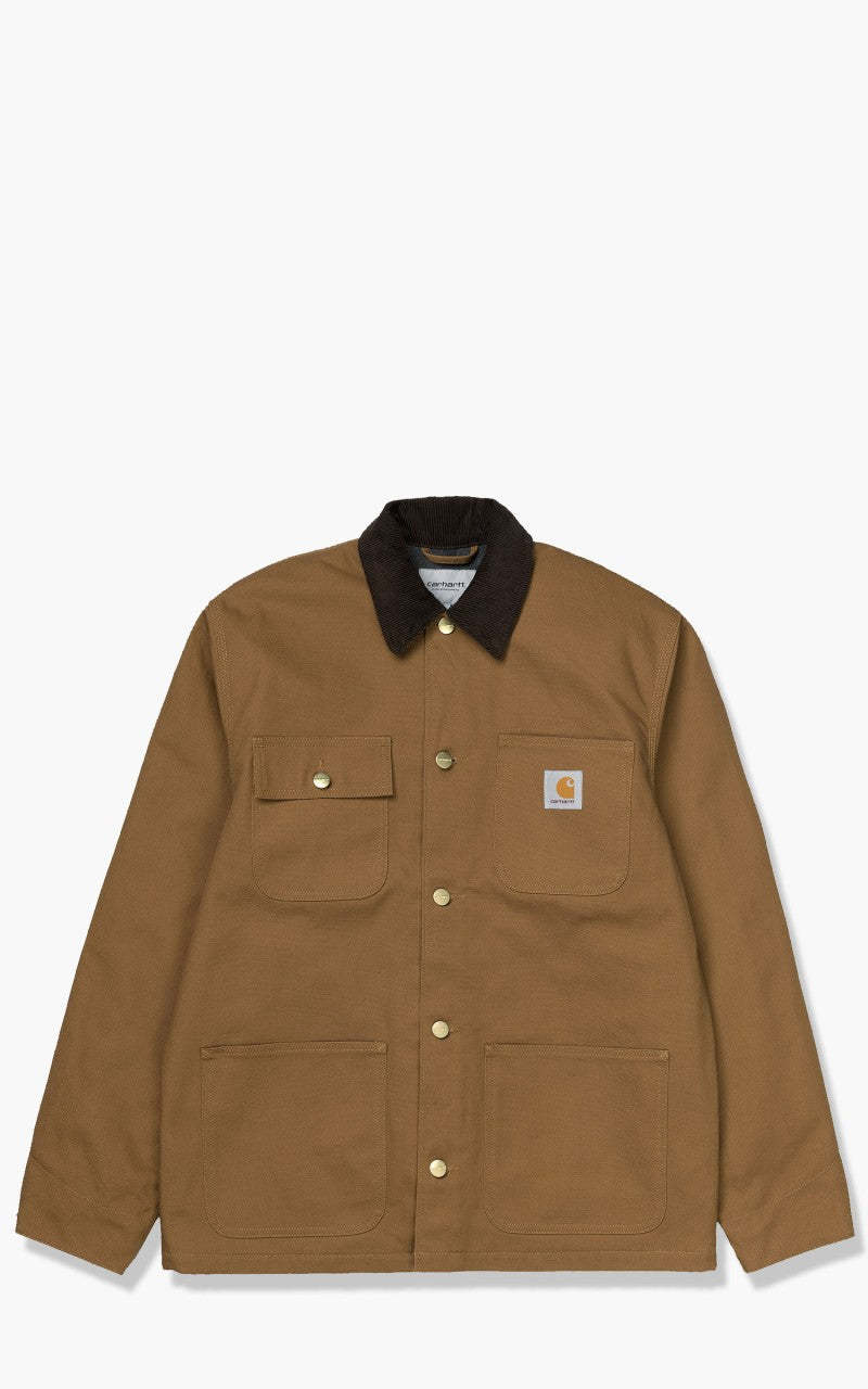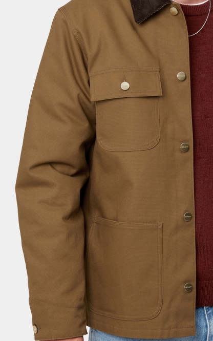 The Michigan Coat is a classic chore coat silhouette, constructed in the iconic, hardwearing Dearborn Canvas, now made from organic cotton. Contrast button and rivet detailing draws from a classic workwear aesthetic. Features a striped blanket lining for increased warmth, along with a corduroy collar, and a classic woven Carhartt WIP label on the left breast pocket.