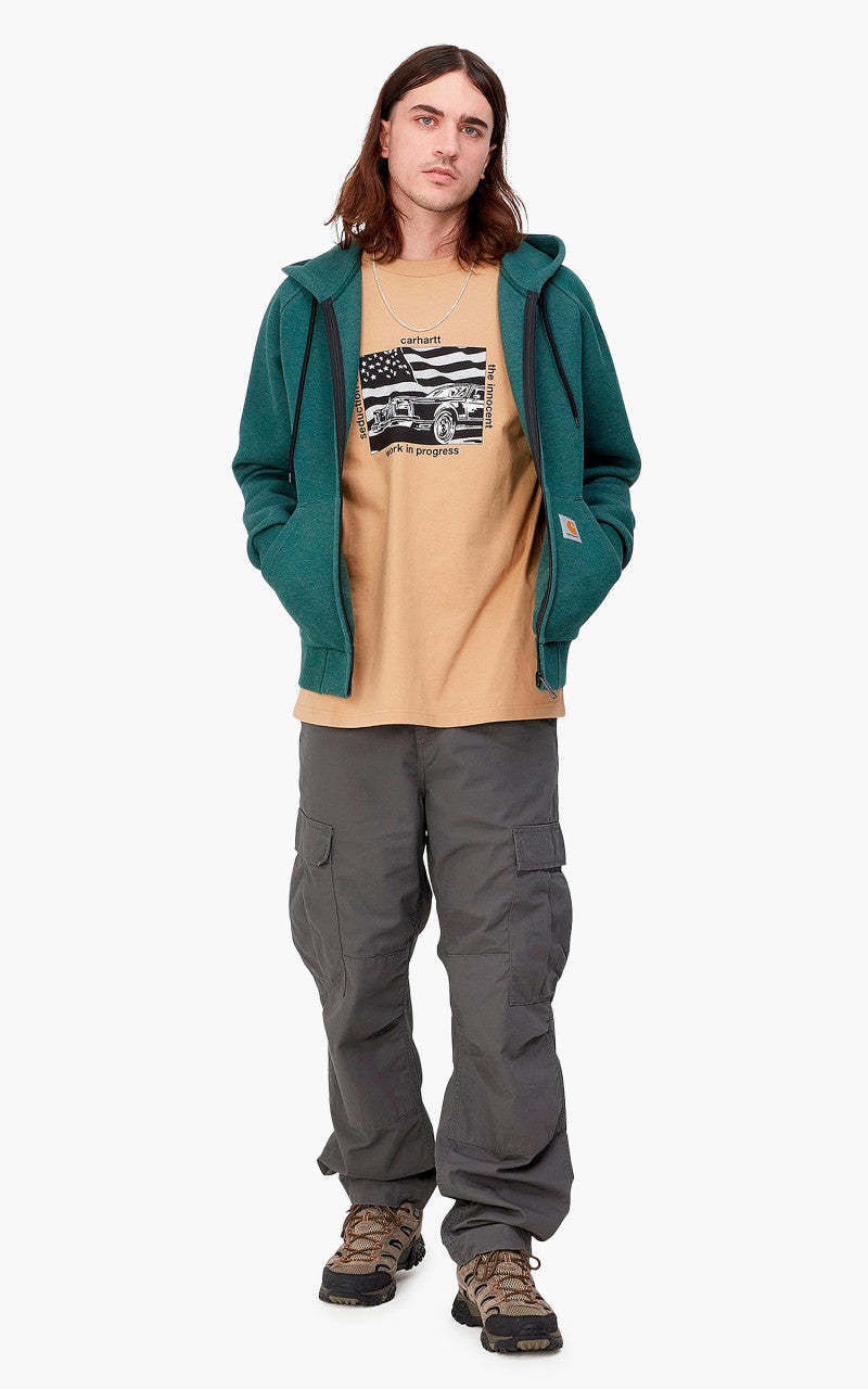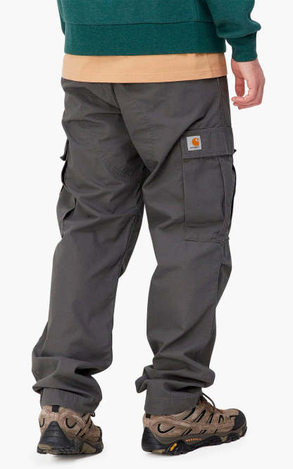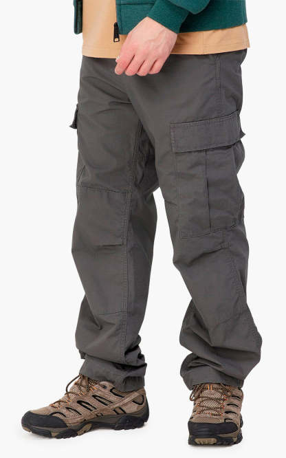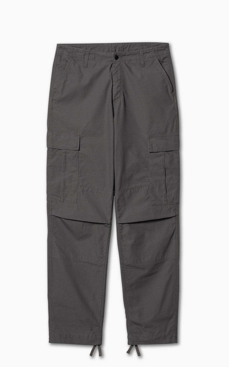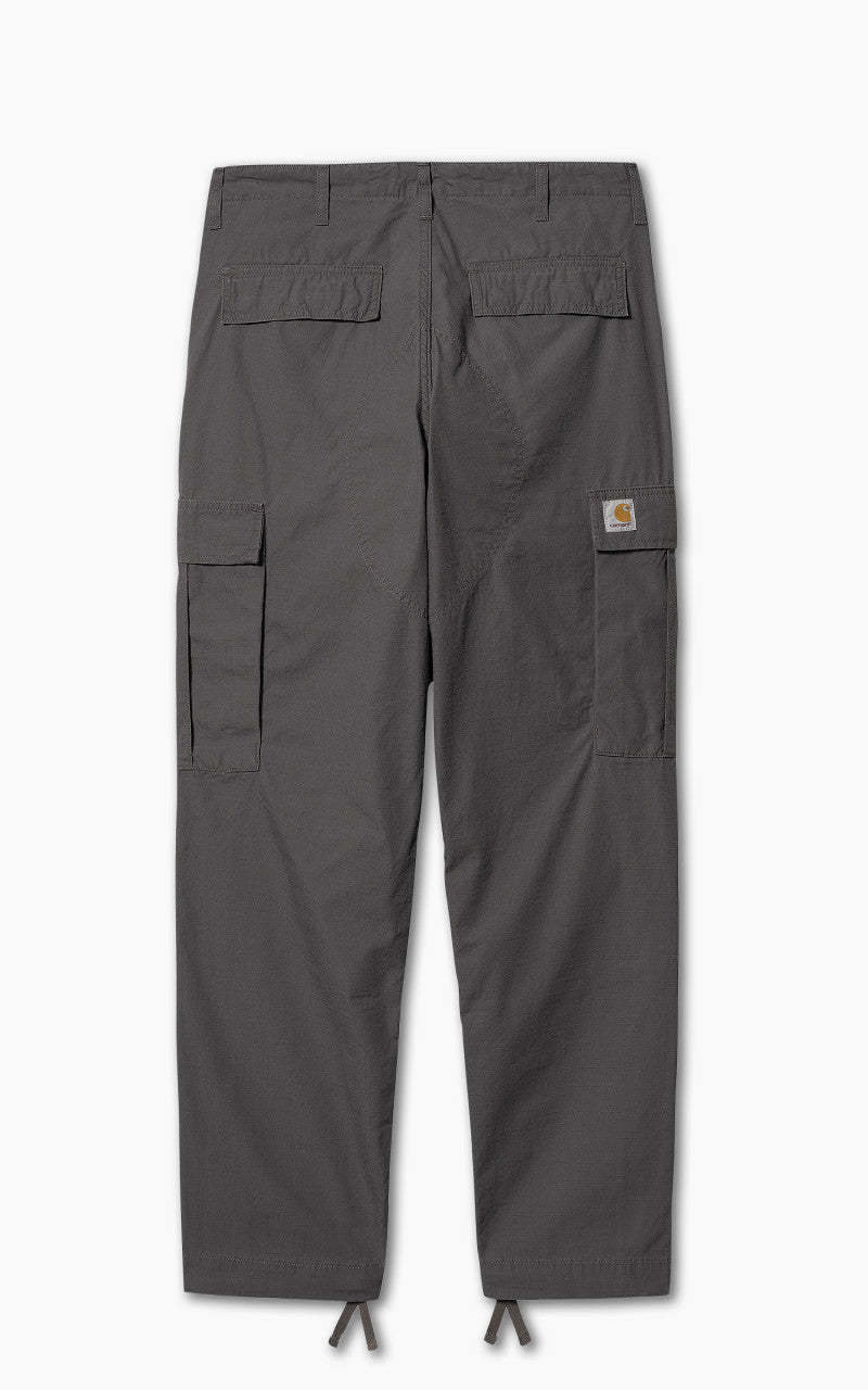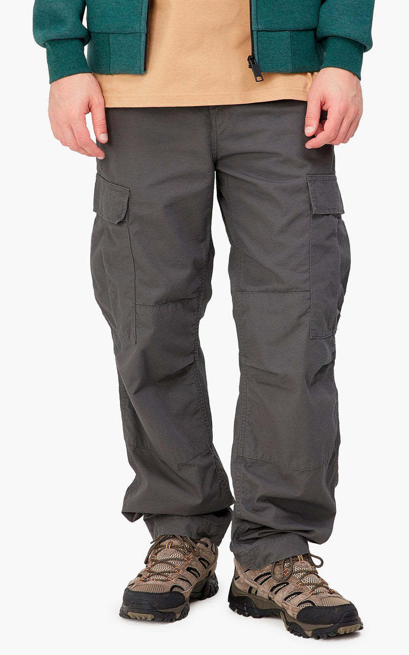 The Regular Cargo Pant is constructed from a lightweight cotton ripstop fabric. This tough cotton has been rinsed for added comfort without sacrificing its durability. Features multiple pockets and a woven Carhartt WIP label on the right leg pocket. Double layer at knee adds to its robust qualities, and tie detailing at leg opening allows for the fit to be adjusted. Regular fit.