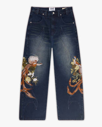 The Eden Denim is cut from heavyweight organic cotton in a deep indigo wash. Detailed peacock and rose embroidery covers each leg, amassing to over 800,000 stitches, with a fully embroidered back pocket hiding the Vescartes name. Finished with custom panelling and premium branded hardware.
