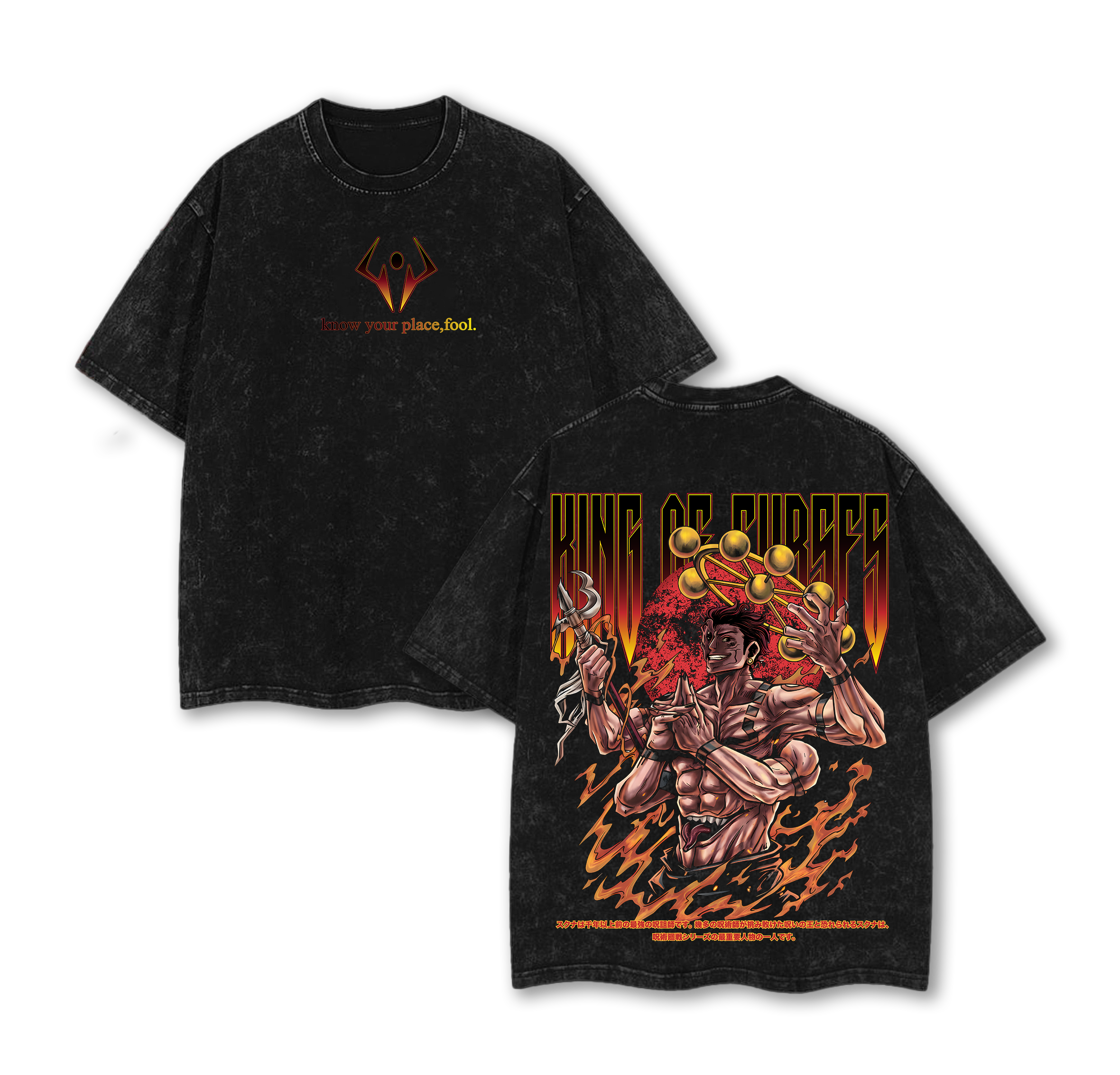 BLACK - TSW - King of Curses Washed Tee | Inspired by Sukuna from Jujutsu World | “Know Your Place, Fool” Graphic | Vintage Anime Streetwear for Dark Aesthetic Fans | Oversized Heavy Cotton T-Shirt