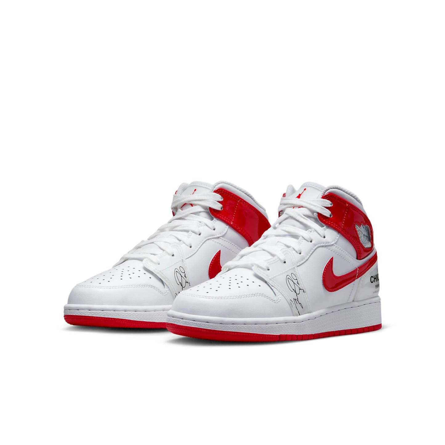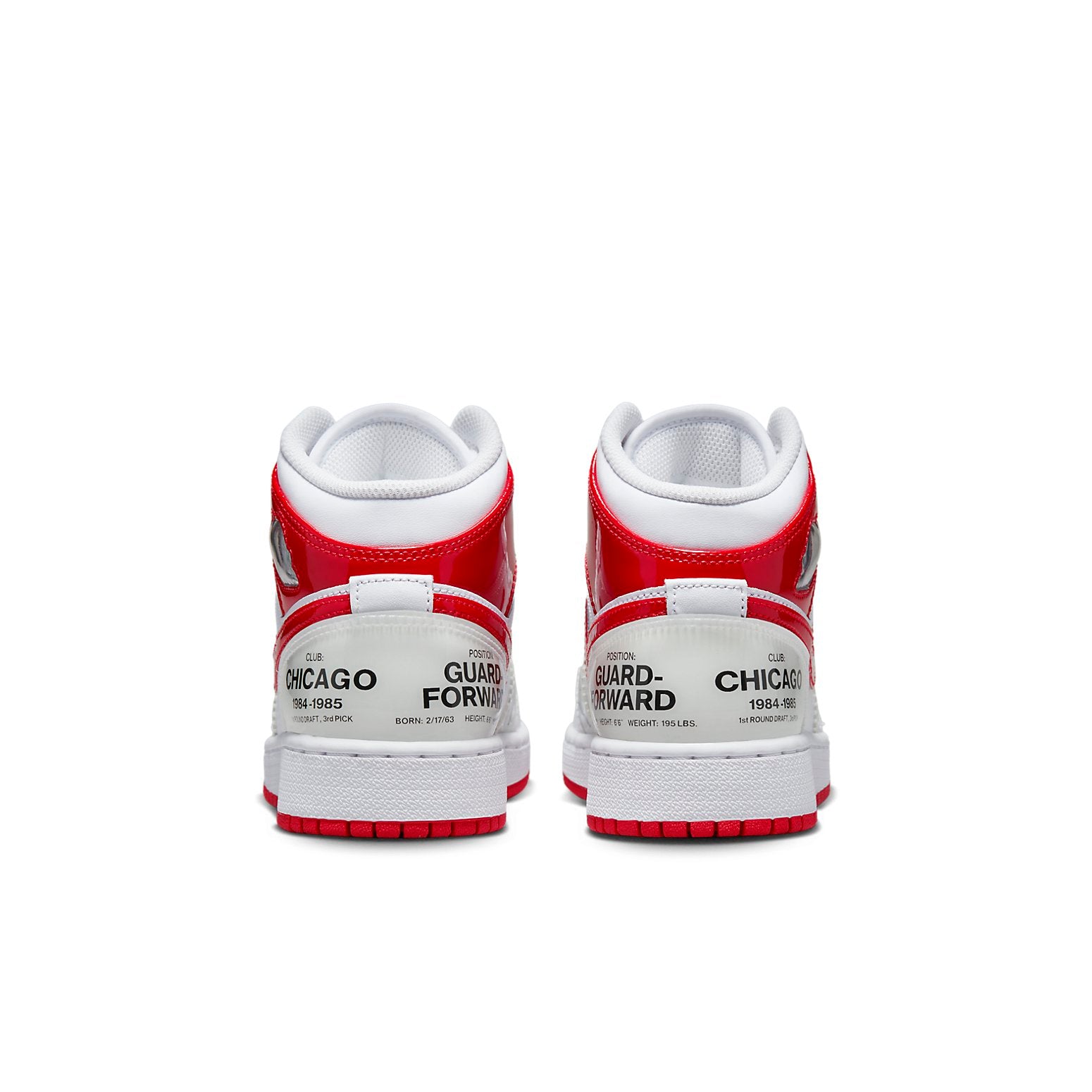The Air Jordan 1 Mid 'Rookie Season' is a stylish sneaker for kids, featuring a simple white leather upper with glossy red overlays on the ankle collar and Swoosh logo. The forefoot features a rainbow-colored wing pattern. The sneaker also has several layers of semi-transparent TPU overlays on the forefoot, heel, and tongue, each with a unique design. On the forefoot, you'll notice Michael Jordan's John Hancock signature, while the heel details Michael's draft night stats and his selection of the Chicago Bulls. This sneaker is perfect for everyday wear and is ideal for any basketball fan.
