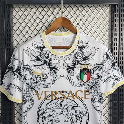 The Italy 2023 Concept Versace White Home Shirt combines football elegance with high fashion. Featuring a clean white base with luxurious gold detailing inspired by Versace, this unique design is a bold statement for any Azzurri fan.