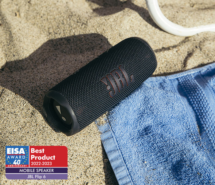 Your adventure. Your soundtrack. The bold JBL Flip 6 delivers powerful JBL Original Pro Sound with exceptional clarity thanks to its 2-way speaker system consisting of an optimized racetrack-shaped driver, separate tweeter, and dual pumping bass radiators. This big-sounding, yet easy to carry speaker is waterproof and dustproof, so you can take it anywhere in any weather. And with 12 hours of battery life, you can party 'til the sun goes down—or comes up—wherever the music moves you. Use PartyBoost to link multiple compatible speakers. The Flip 6 comes in a variety of cool colors.