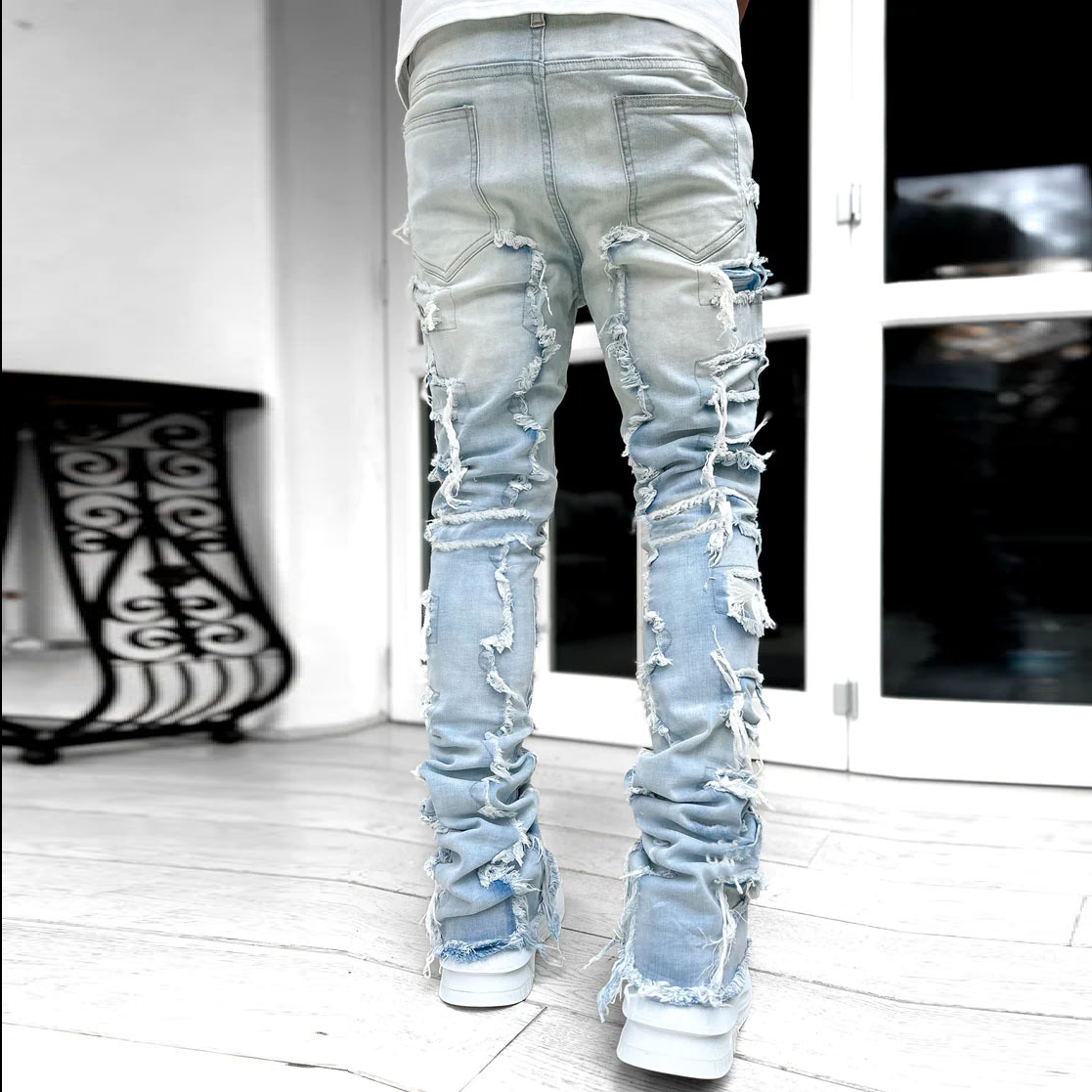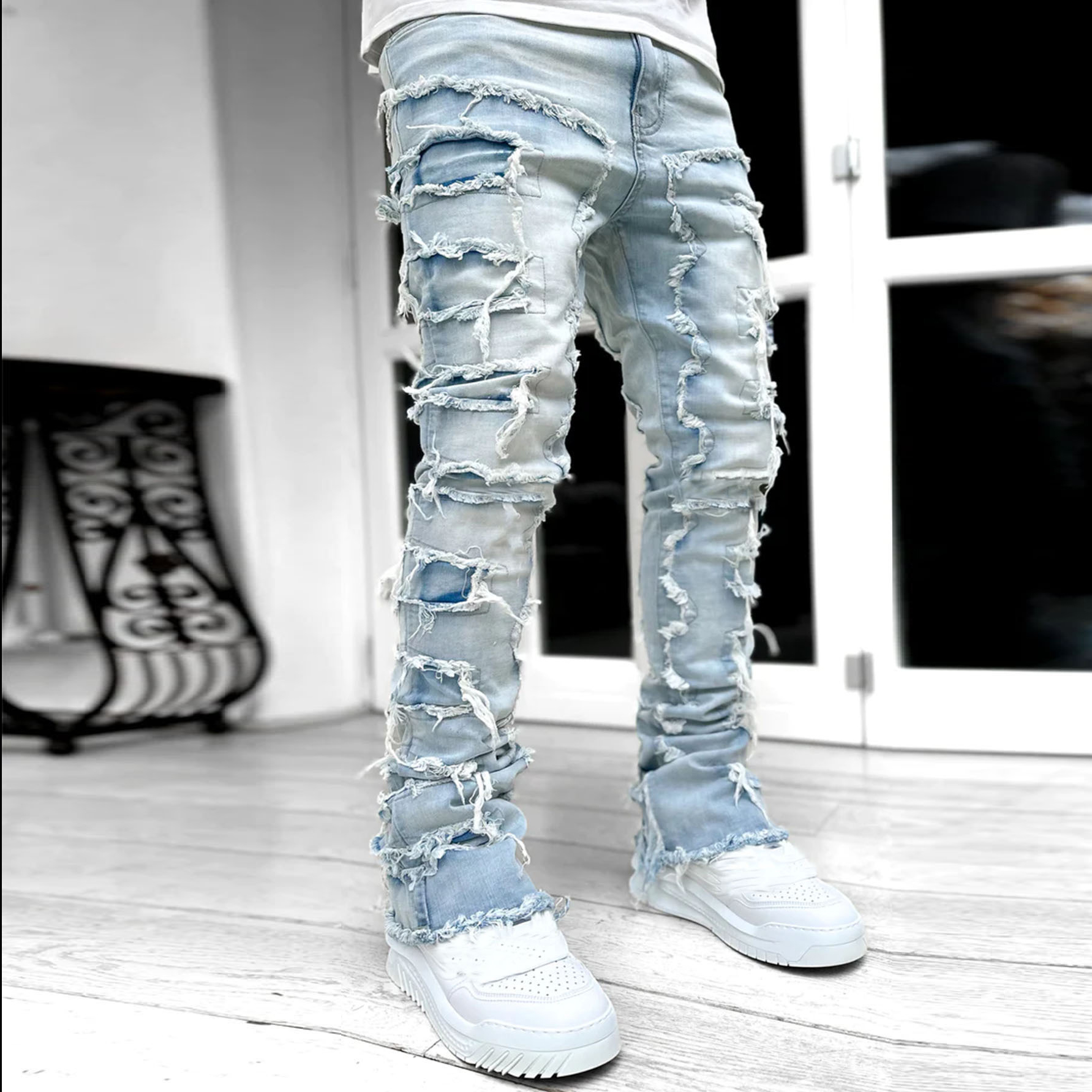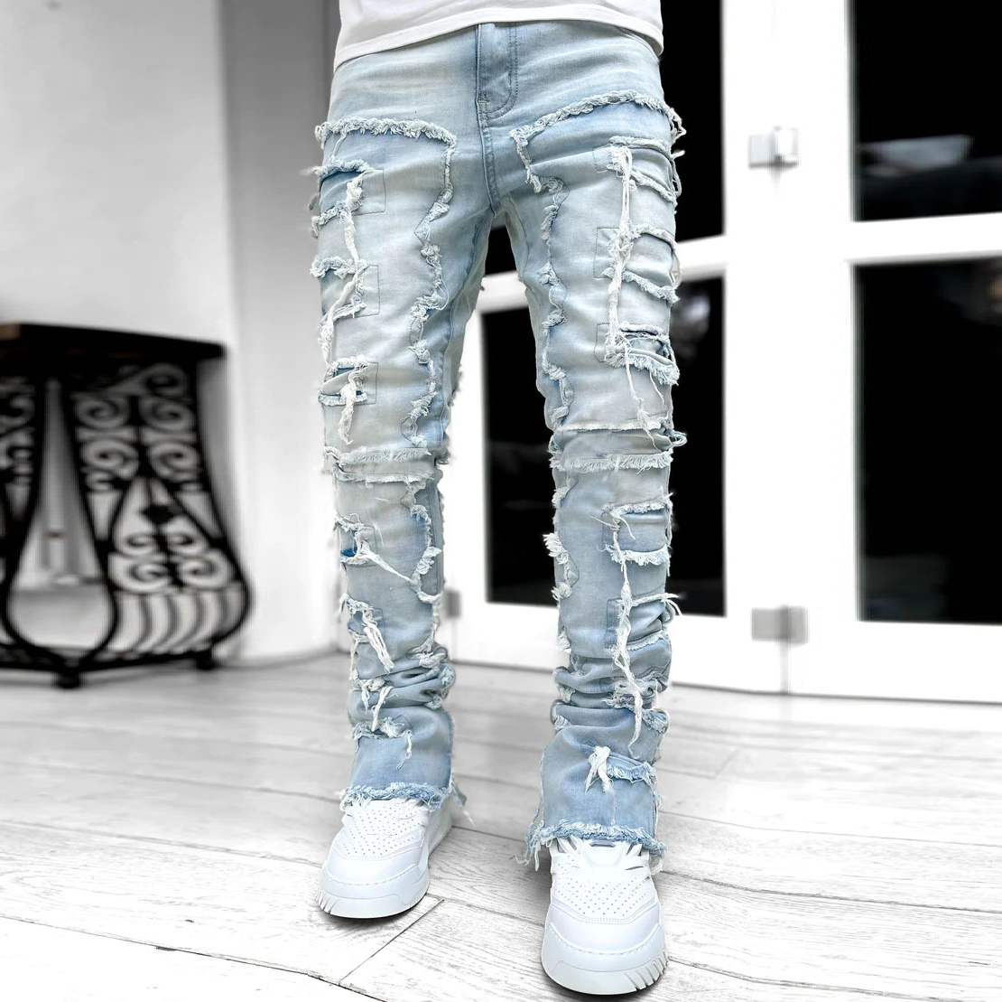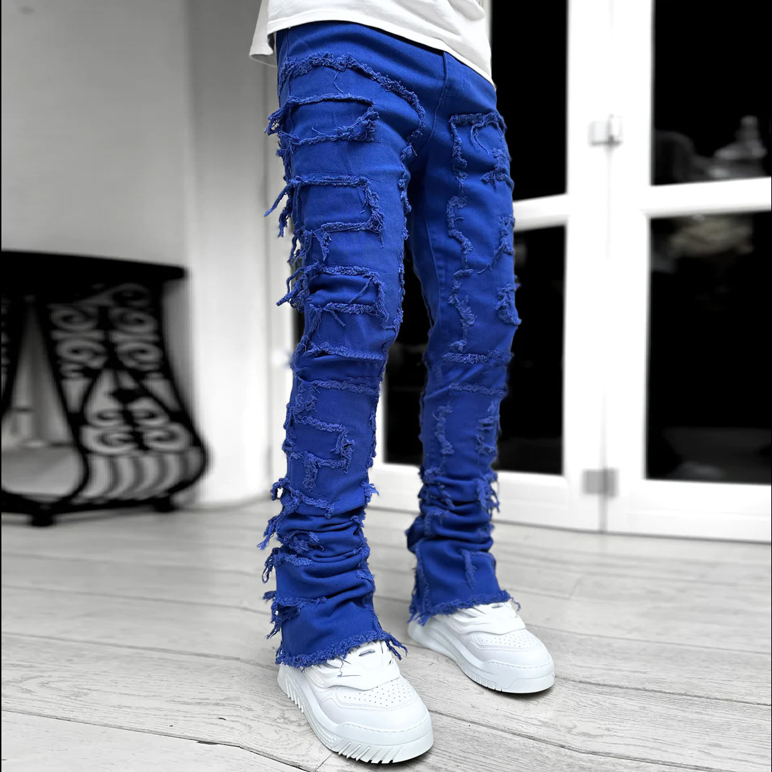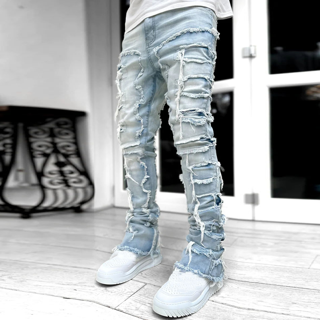 Men's Street Fashion Stretch Patch Denim Straight Leg Pants
