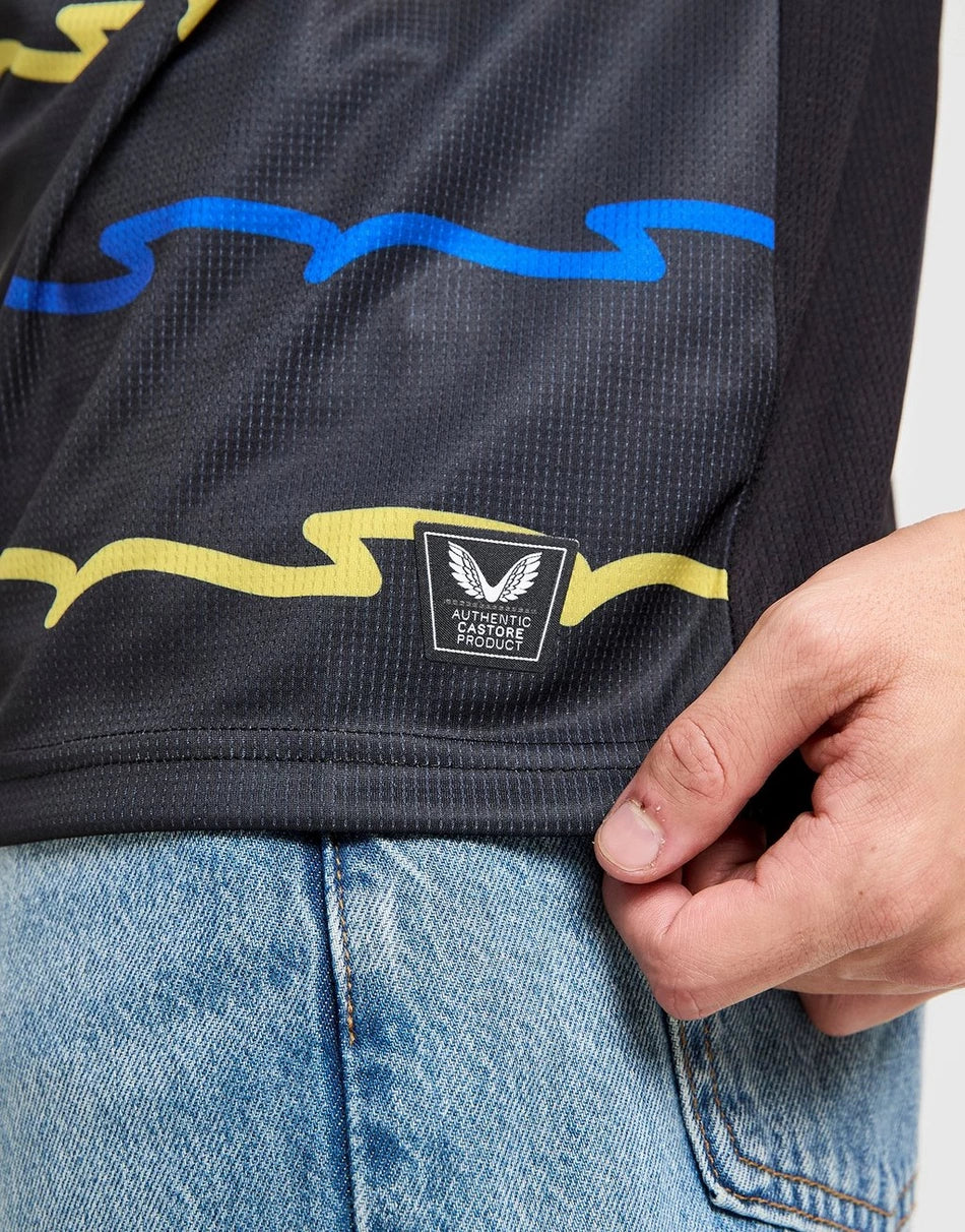 The Everton FC 2025/26 Third Shirt, produced by Castore, features a bold black base adorned with abstract blue and yellow wave patterns. These dynamic lines symbolize the ripples of the River Mersey, reflecting the club's new riverside home at Hill Dickinson Stadium. The shirt includes a crew neck collar and the Prince Rupert's Tower icon on the chest, paying homage to the club's heritage. Available in both pro and replica versions for men and women, the kit offers an option without the sponsor logo for fans who prefer a cleaner design.