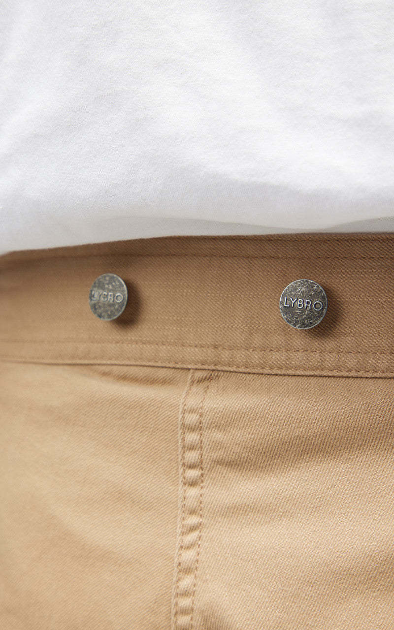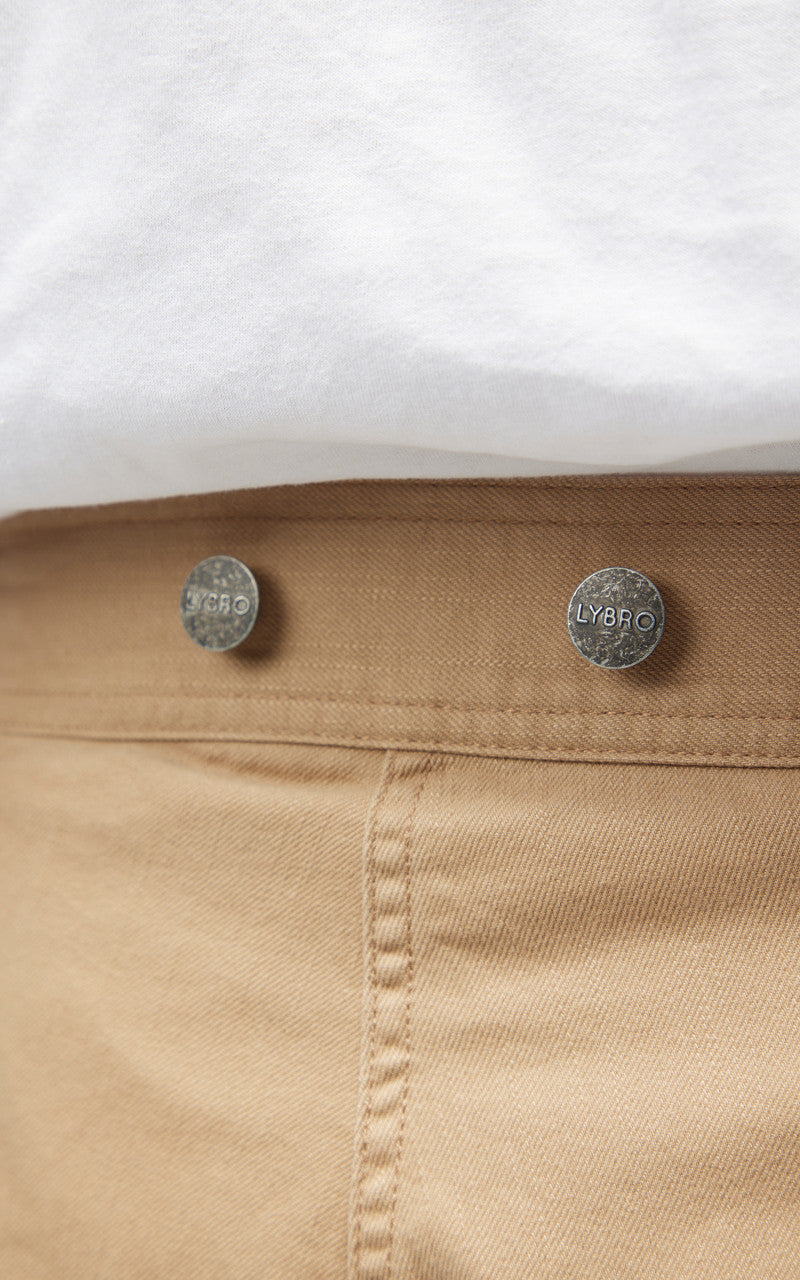 The Railroad Pants is a straight leg, workwear style trouser made in a hardwearing cotton twill woven fabric. Featuring on seam, side entry pockets, these pants also have a traditional utility pocket on the leg with extra stitching for strength. With a classic jean style fly with metal shank buttons and Lybro branded buttons at the waistband suitable for use with braces, contrast colour bartacks have been sewn to reinforce the pockets to ensure durability and longevity of the garment.