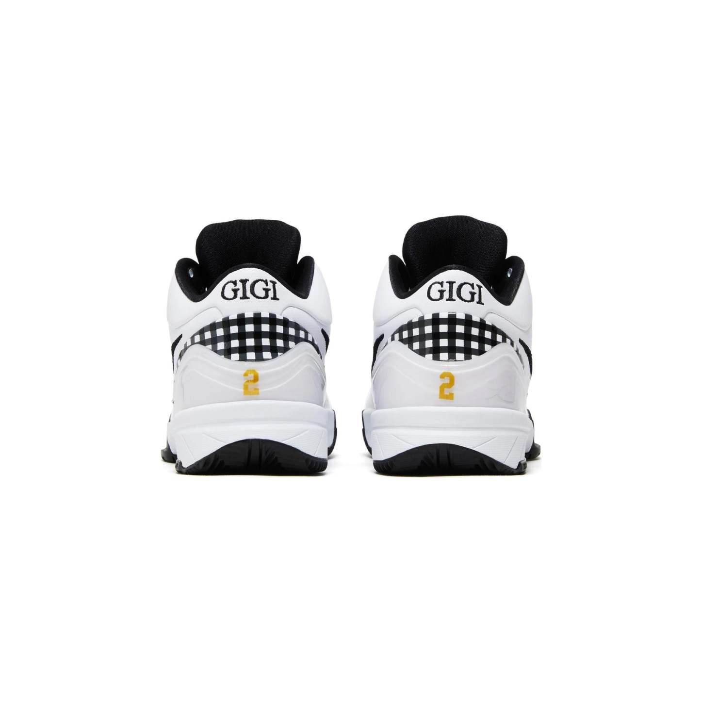 The 'Mambacita Gigi' edition showcases a sleek "White" and "Black" color scheme, with a clean white leather upper accentuated by subtle black details. The shoe features a textured black overlay that recalls the iconic snakeskin pattern associated with Bryant's 'Mamba' persona. A unique touch is found in the "Gigi" inscription on the heel, a heartfelt nod to Kobe's daughter. The sneaker's translucent outsole reveals a distinctive black and white speckled design, enhancing both visual appeal and traction. The innovative Zoom Air cushioning ensures top-tier performance on the court, while the responsive foam midsole delivers comfort and stability. This Protro variant integrates contemporary updates to improve durability and support, making it a fitting homage to the Bryant legacy.
