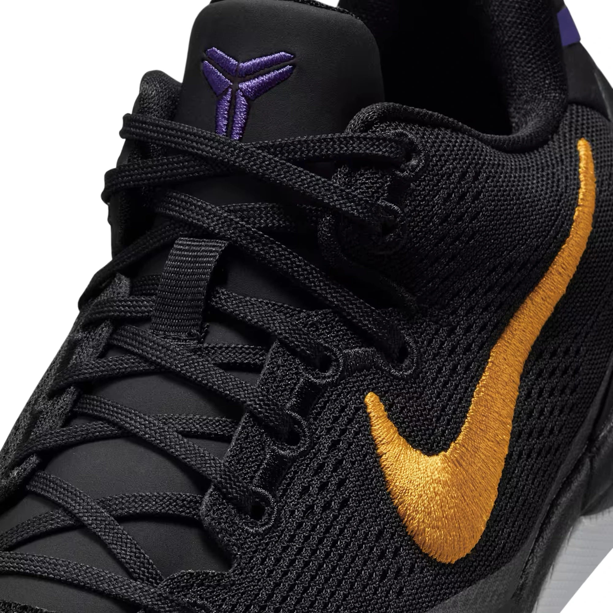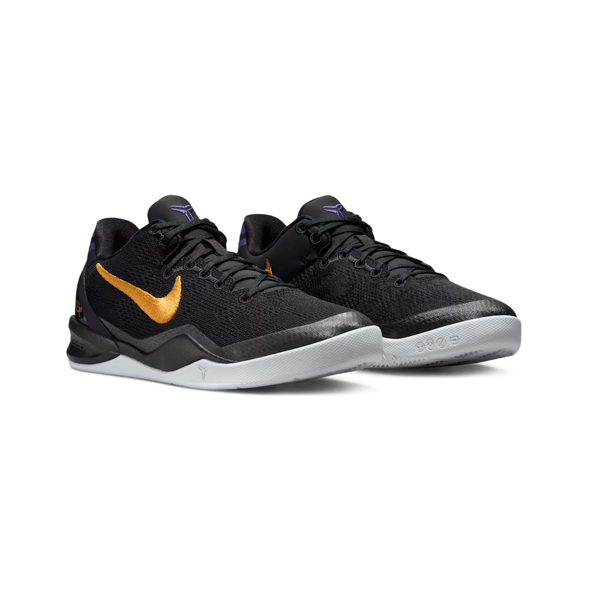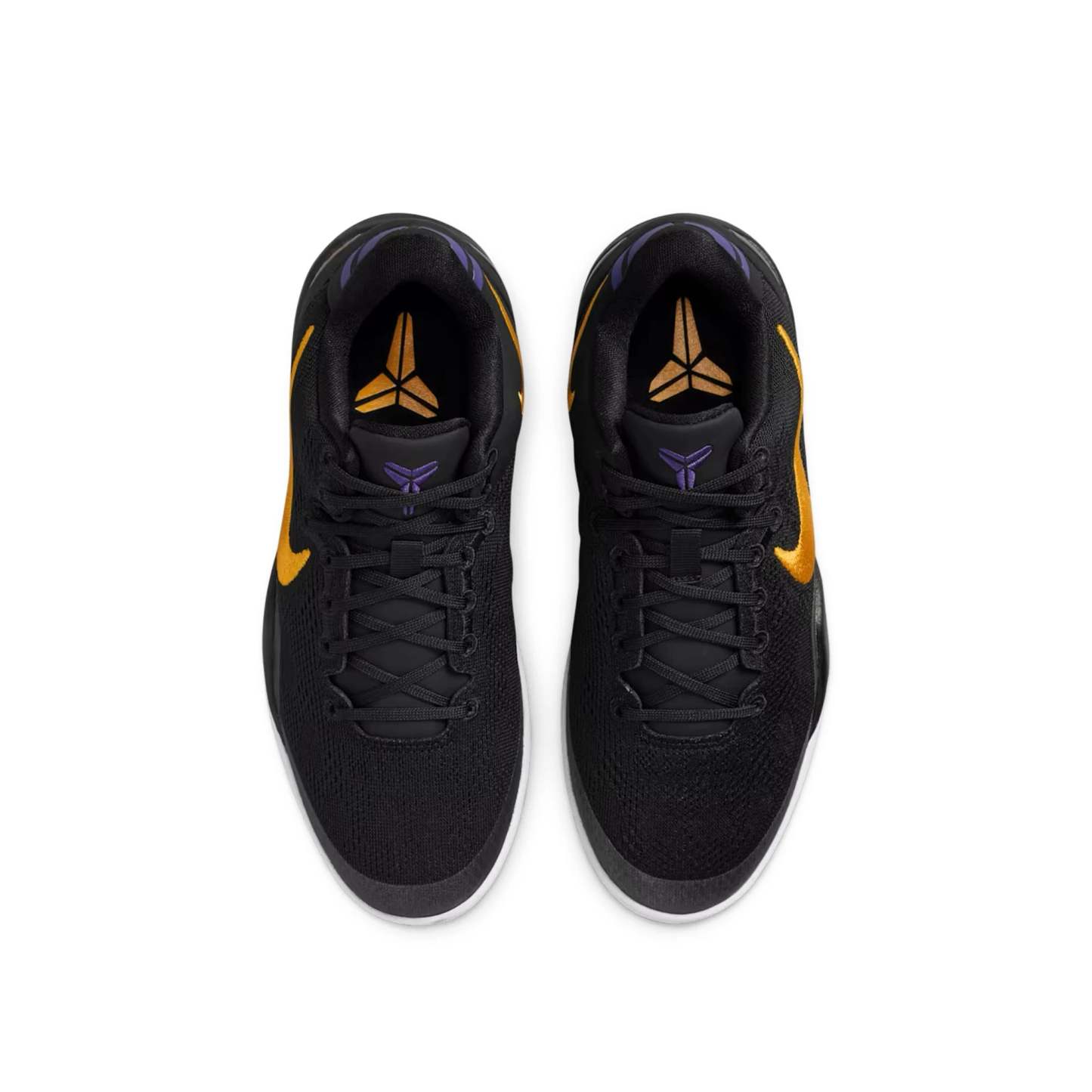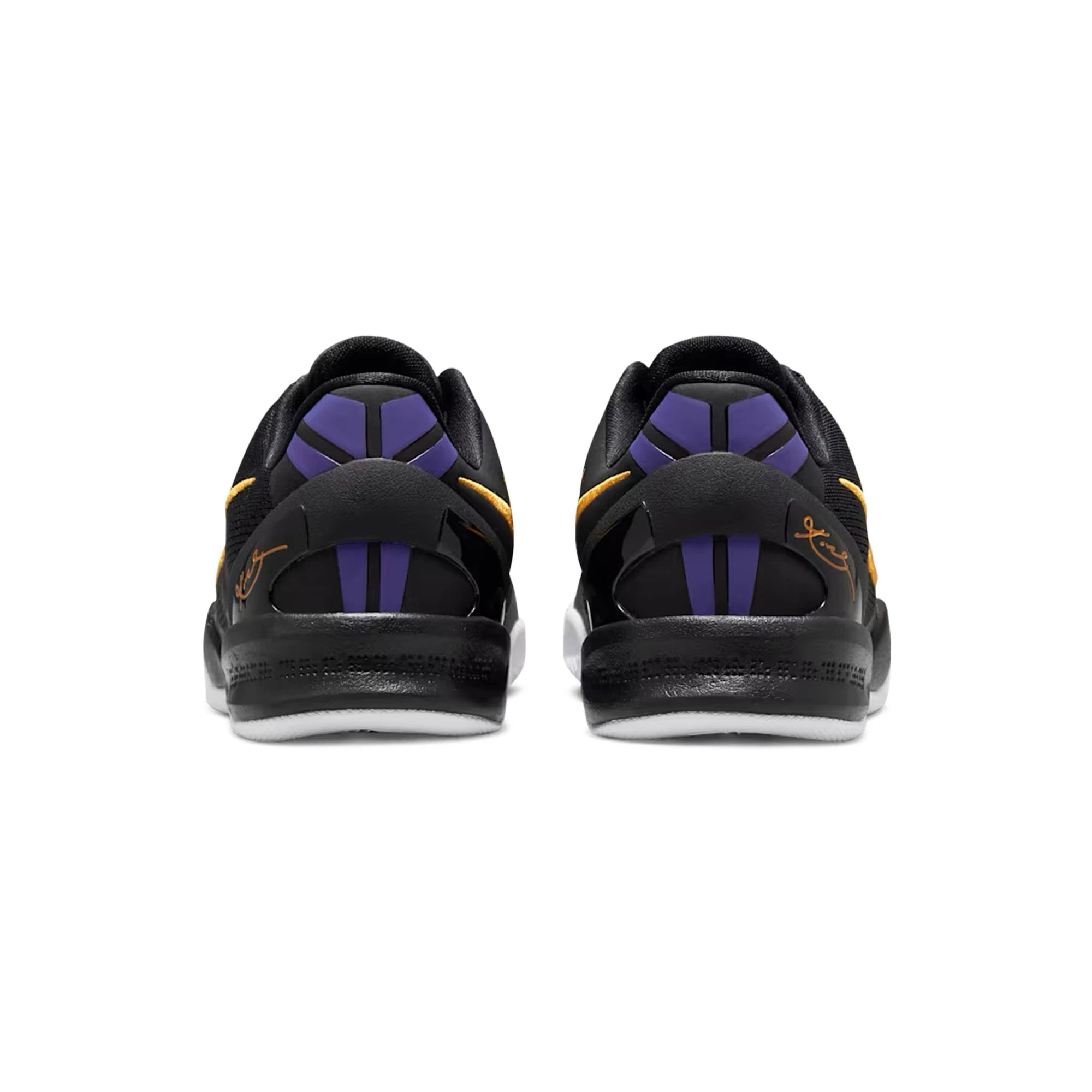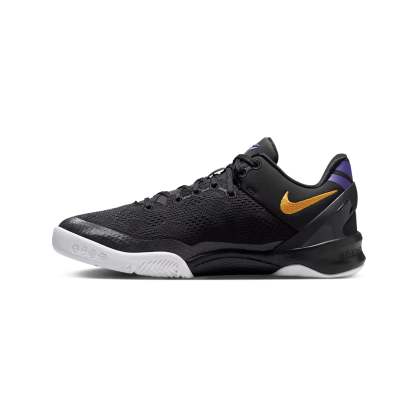 Nike Kobe 8 “Lakers Away” GS (2024) is a standout in the Kobe Protro line — bringing together elite performance, Lakers heritage, and contemporary tech for the younger generation. It delivers the speed, style, and functionality that Kobe Bryant fans and basketball players demand.OverviewThe Nike Kobe 8 “Lakers Away” GS revives the famed Kobe 8 silhouette with modern updates under Nike’s Protro (Performance + Retro) refinement. It released September 6, 2024 in full-family sizing (men’s, grade school, preschool) under the style code FN0266-002 for GS. The colorway — Black / University Gold / White / Court Purple — directly nods to the Lakers’ iconic away uniform scheme. Performance-wise, this GS version shares the upgraded features of the Protro line: improved cushioning, engineered mesh upper, no-sew overlays for reduced weight, enhanced stability via a carbon shank plate, and durable traction ideal for indoor courts. Key Highlights• Lakers Away Colorway: Black upper accented with University Gold Swooshes, Court Purple detailing, and white midsole/outsole — a direct homage to the purple-and-gold legacy of the Lakers. • Protro Technology: React foam midsole replacing the original’s Lunarlon, paired with a lightweight performance-oriented mesh upper and no-sew overlays for agility and breathability. • Traction & Stability: Full rubber outsole with herringbone pattern allows sharp cuts; carbon fiber or carbon plate (mid-foot shank) adds rigidity and torsional support.