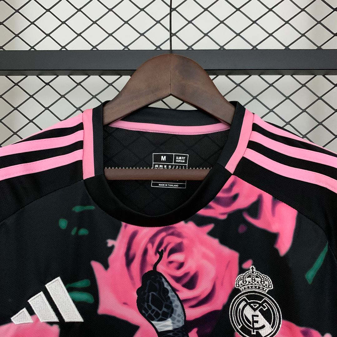 Stand out with the Real Madrid Pink Snake Kit, a daring fusion of elegance and power. Featuring a vibrant pink base with subtle snake-scale patterns, it symbolizes confidence, energy, and dominance. Made from lightweight, breathable fabric, it delivers top performance with unmistakable Los Blancos flair.