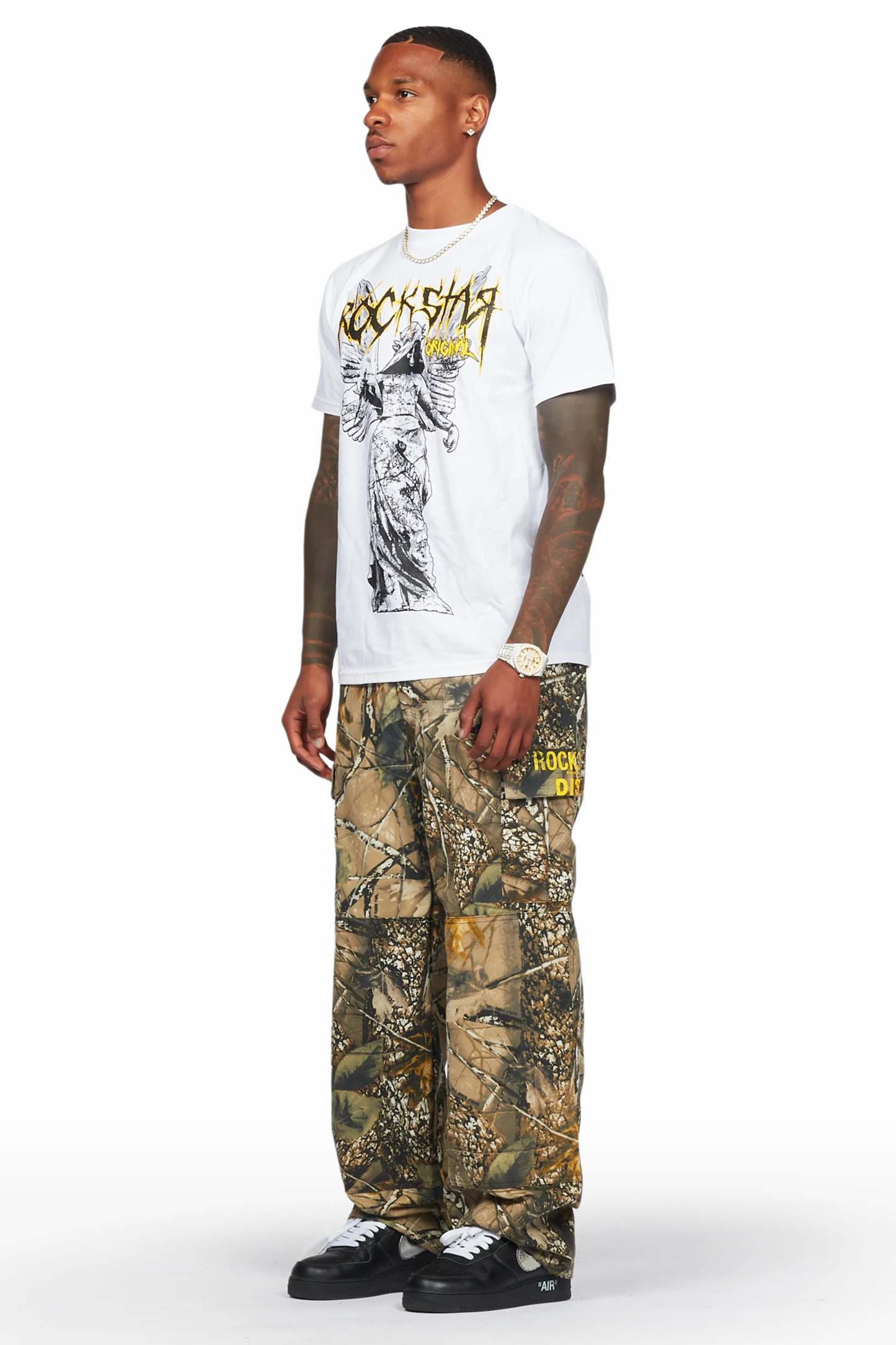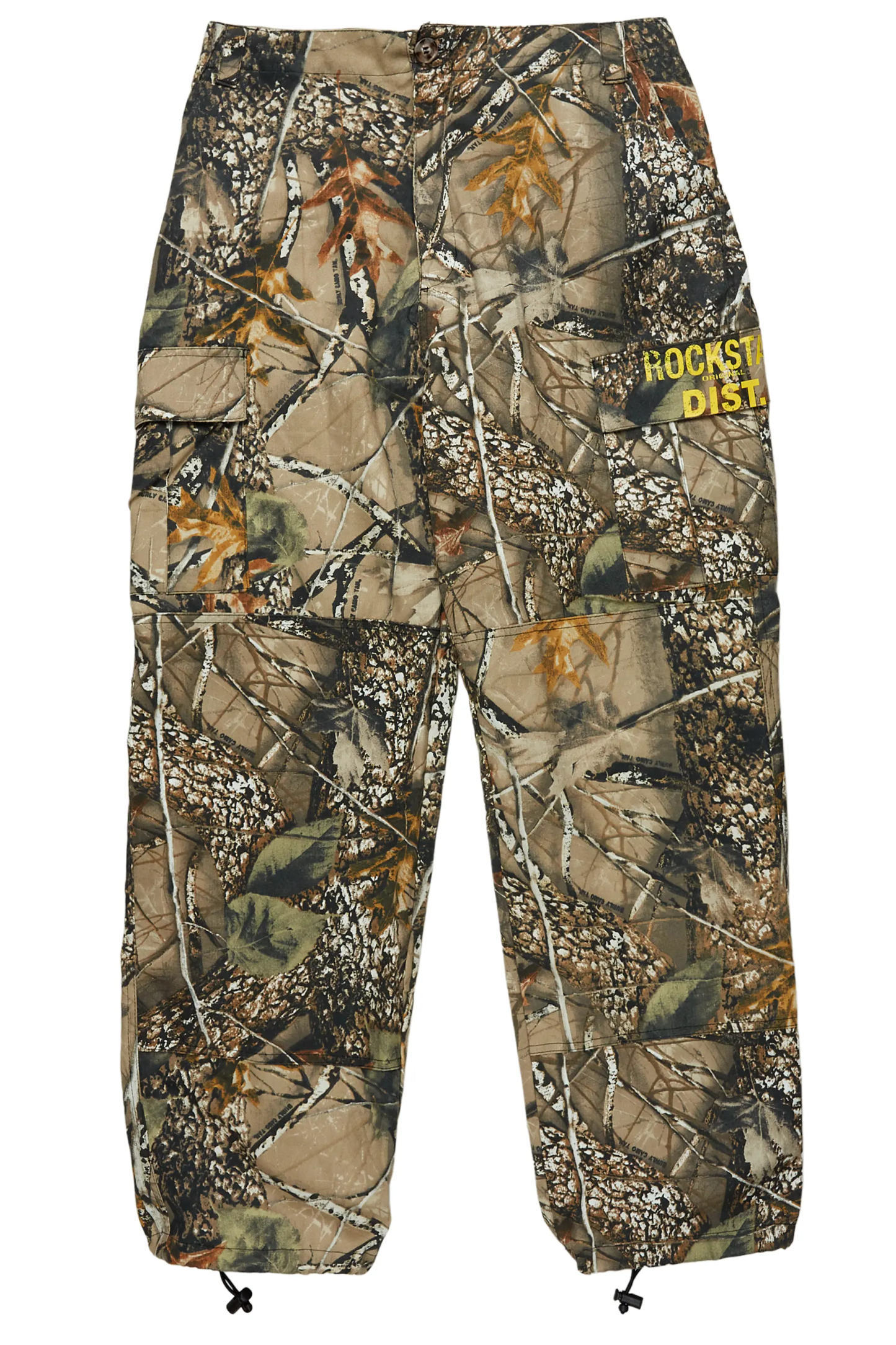A pair of urban baggy cargo pants for men in beige tree camo. Designed with ultra soft organic cotton and an oversized-fit for a dope streetwear style.