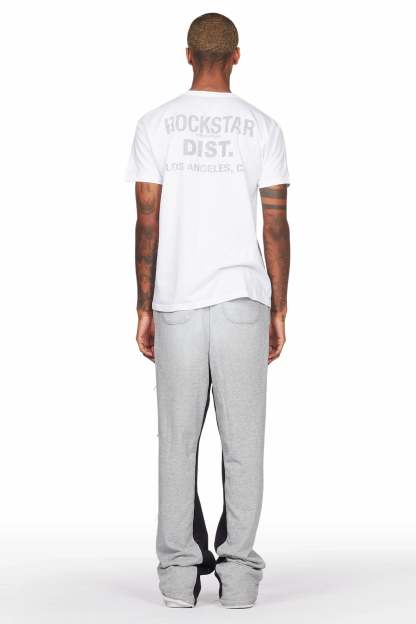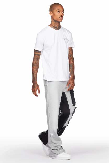 A pair of urban streetwear stacked baggy track pants for men in grey. Designed with ultra soft organic cotton and extra long legs for a must-cop athleisure style.