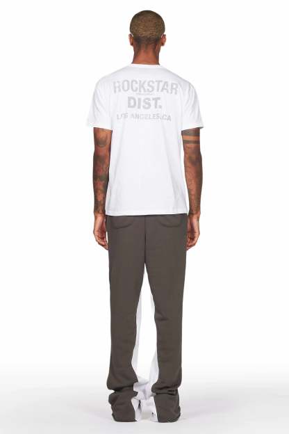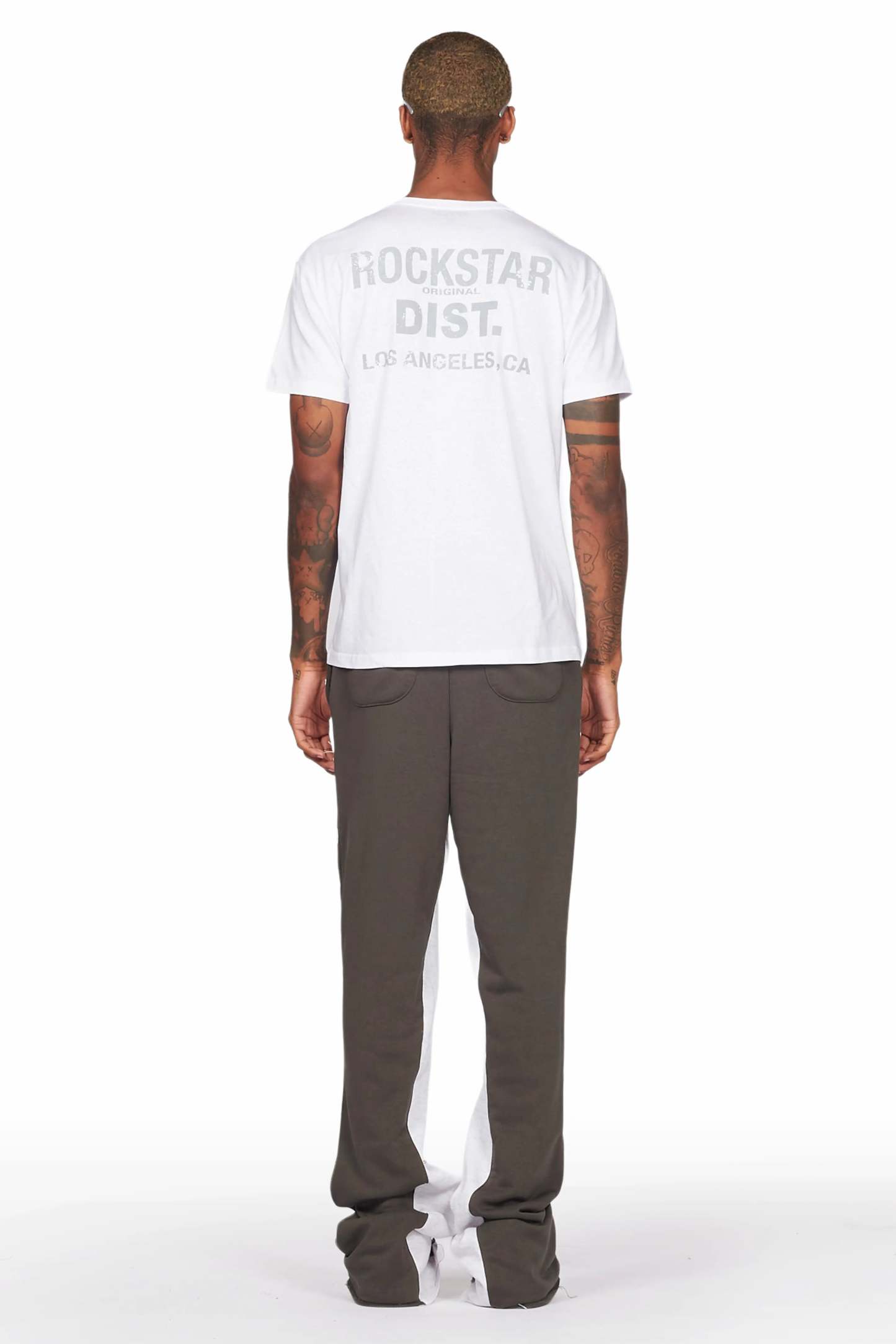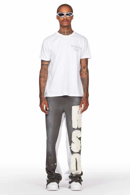 A pair of urban streetwear stacked baggy track pants for men in olive. Designed with ultra soft organic cotton and extra long legs for a must-cop athleisure style.