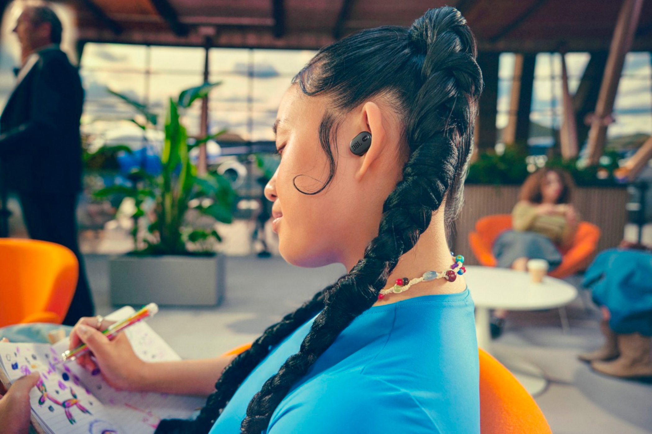 JBL Tune Buds 2 earbuds use Adaptive Noise Cancelling to tune out noises entirely or just let in as much of the outside world you want. Ambient Aware adapts how much of the outside world you want to hear, while TalkThru lets you talk with those around you—all without taking your earbuds out.