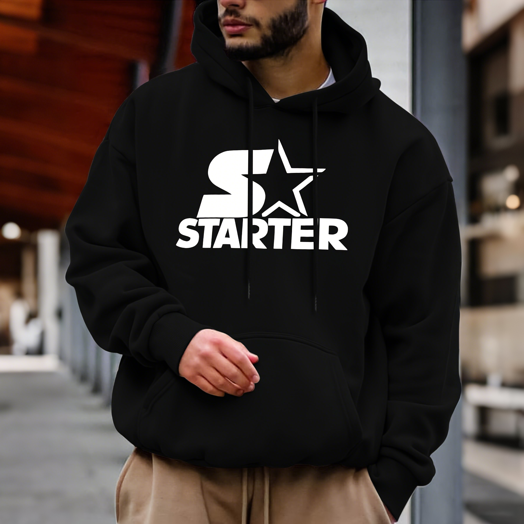 • Design Elements: Bold star graphic print, front pouch pocket, drawstring hood