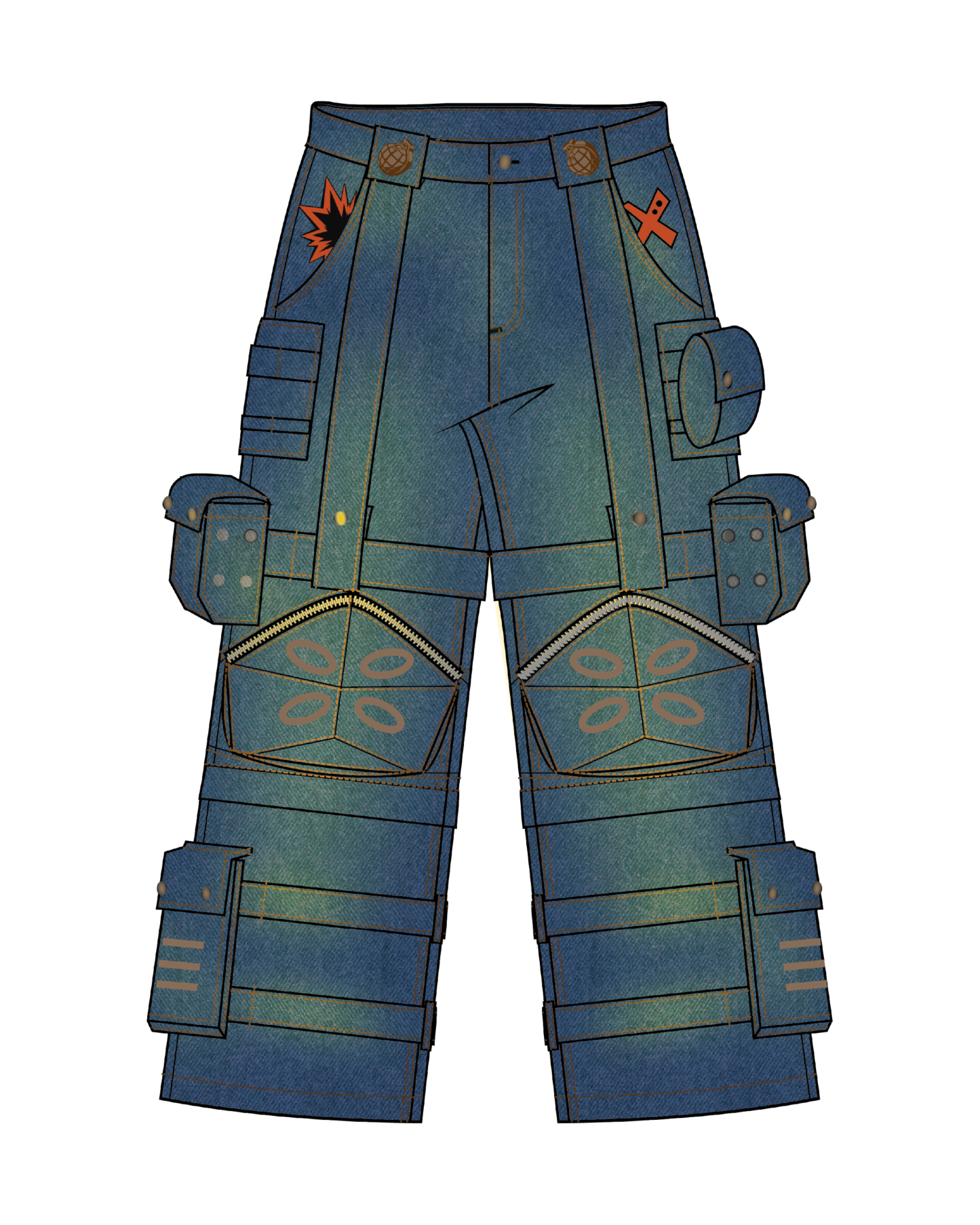 These pants are made of High-Quality Heavyweight Washed Denim with many detachable pockets on each side. It's convertible into shorts by unzipping the bottom parts of the pants. Embroidery designs on the pockets on the front and back. We also added straps on the bottom of the pants so you can adjust them to give them a tighter look.